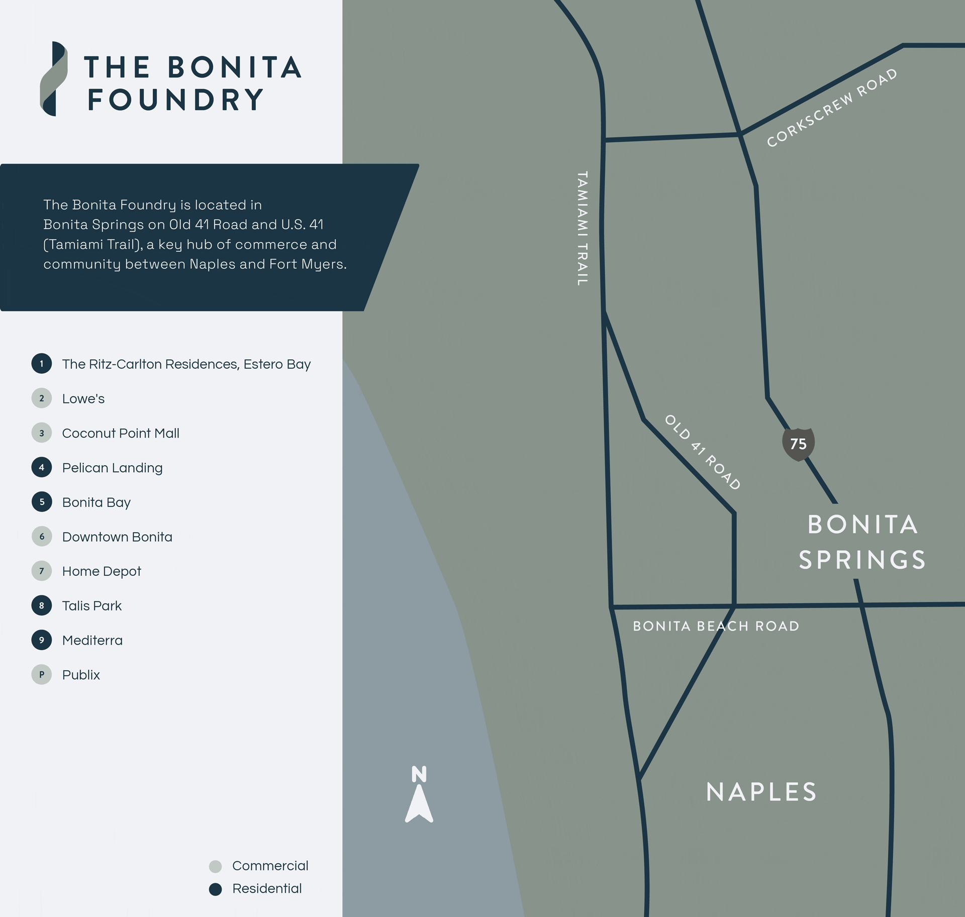 Located in the heart of Bonita Springs on Old 41 Road, The Bonita Foundry offers premium flex-commercial space for lease and luxury storage condominiums for purchase. Perfectly positioned between Naples and Fort Myers, this location sits at the convergence of major residential access and commercial growth. With seamless access to I-75 and proximity to affluent neighborhoods and vibrant retail, you’re just minutes from clients, service partners and home. Strong demographics and ongoing population growth make The Bonita Foundry an ideal foundation for long-term success.